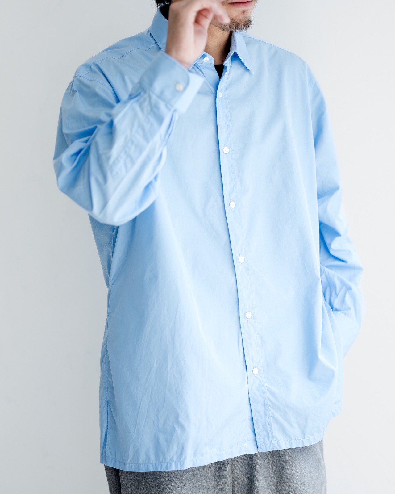 細番手の最高級コットンが生み出せる程よいハリと柔らかさ、軽い質感は体を動かす度に表情を変え、また繊細な織り地の表情も見事。