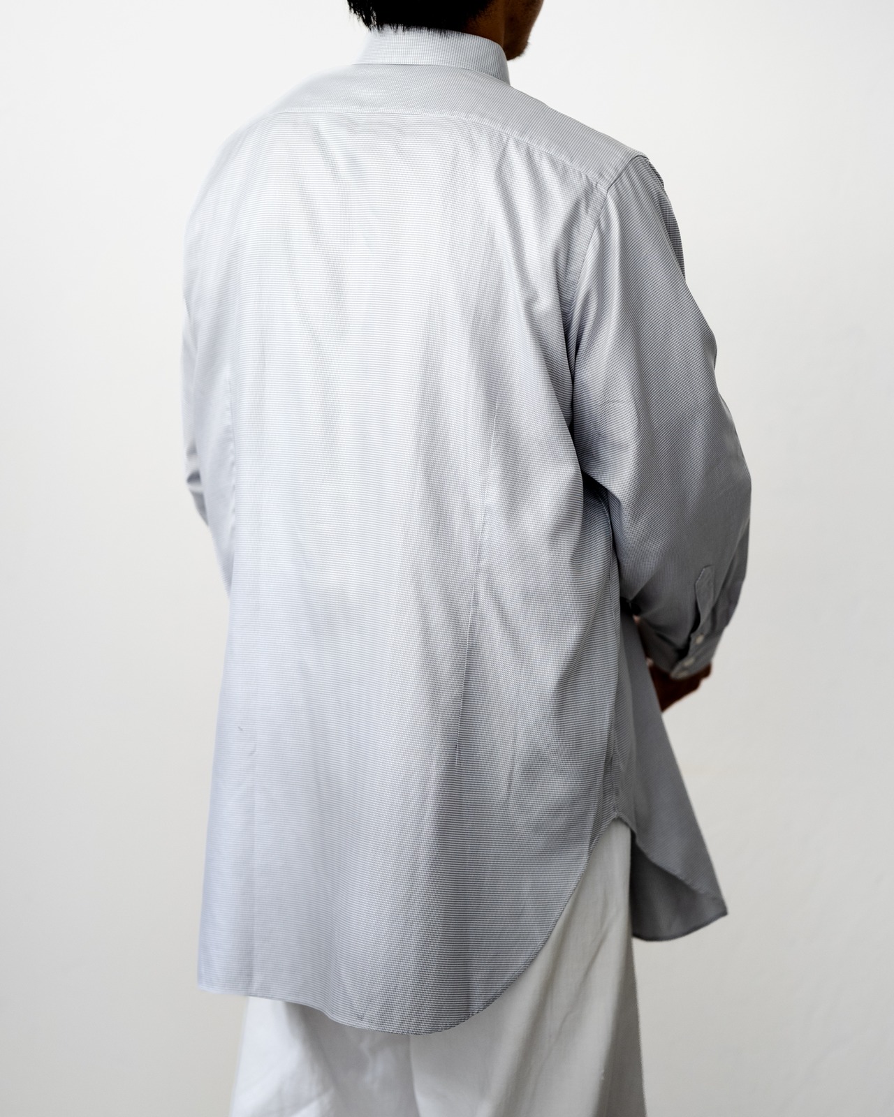 グレーとホワイトのシンプルな色合いですが、最高級コットンのハリとコシ、光沢が描く美しい表情は、モノトーンのものとは思えないほどに豊かな風合いを放ちます。