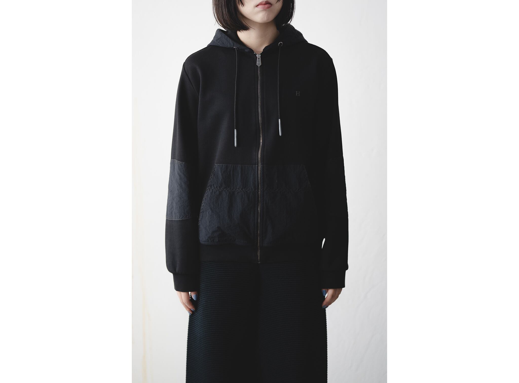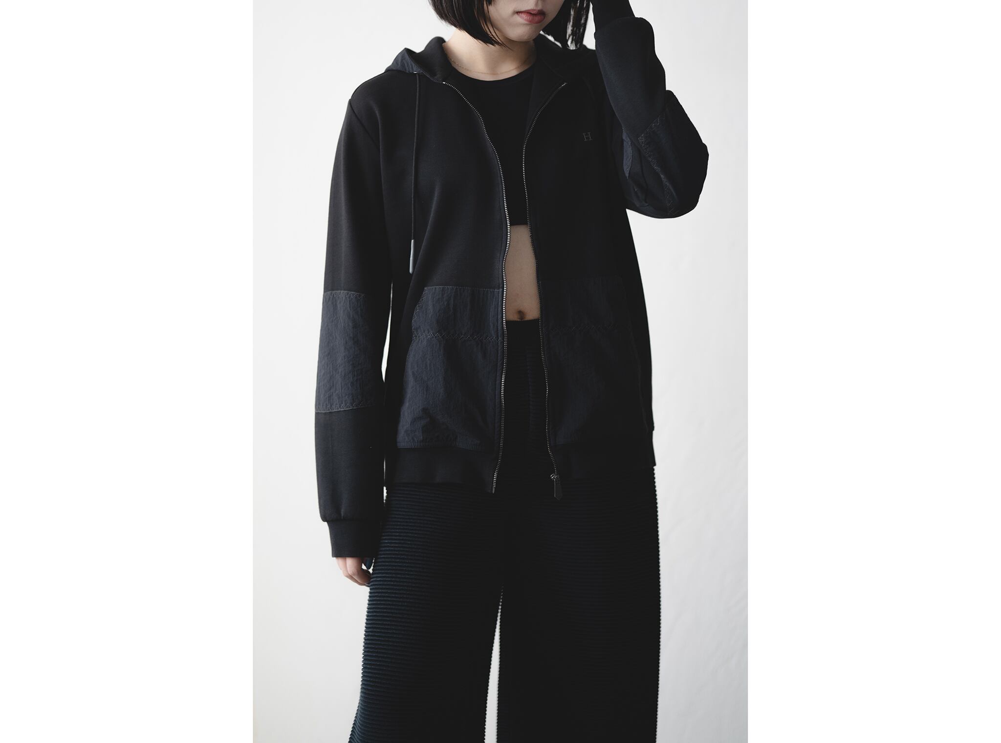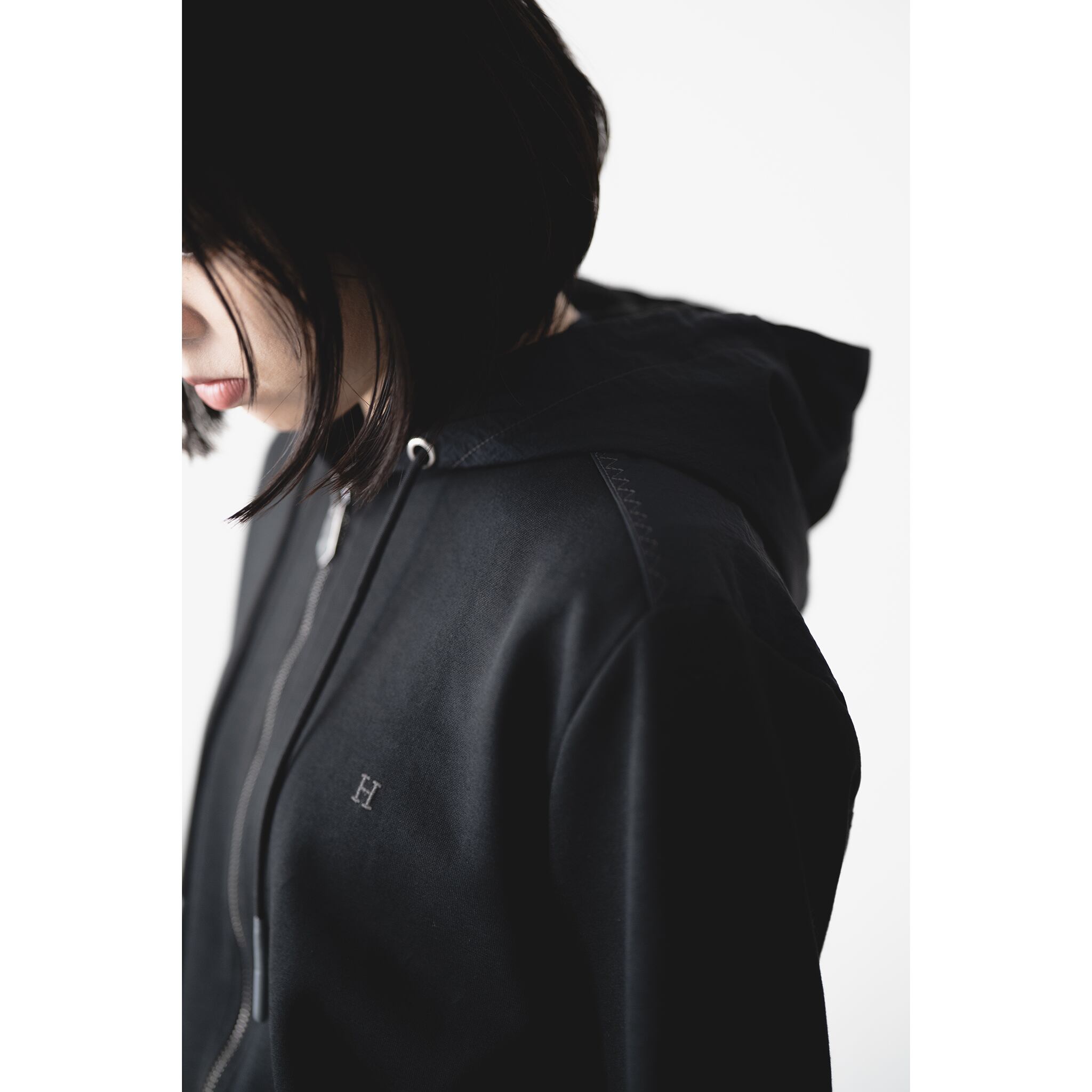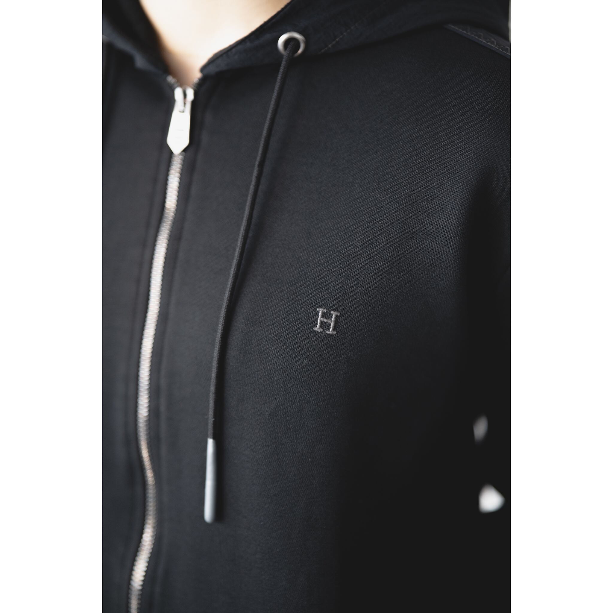 そして胸元に刺繍された、イニシャルロゴの「H」に、ブランドのアイコニックな輝くジップパーツ。