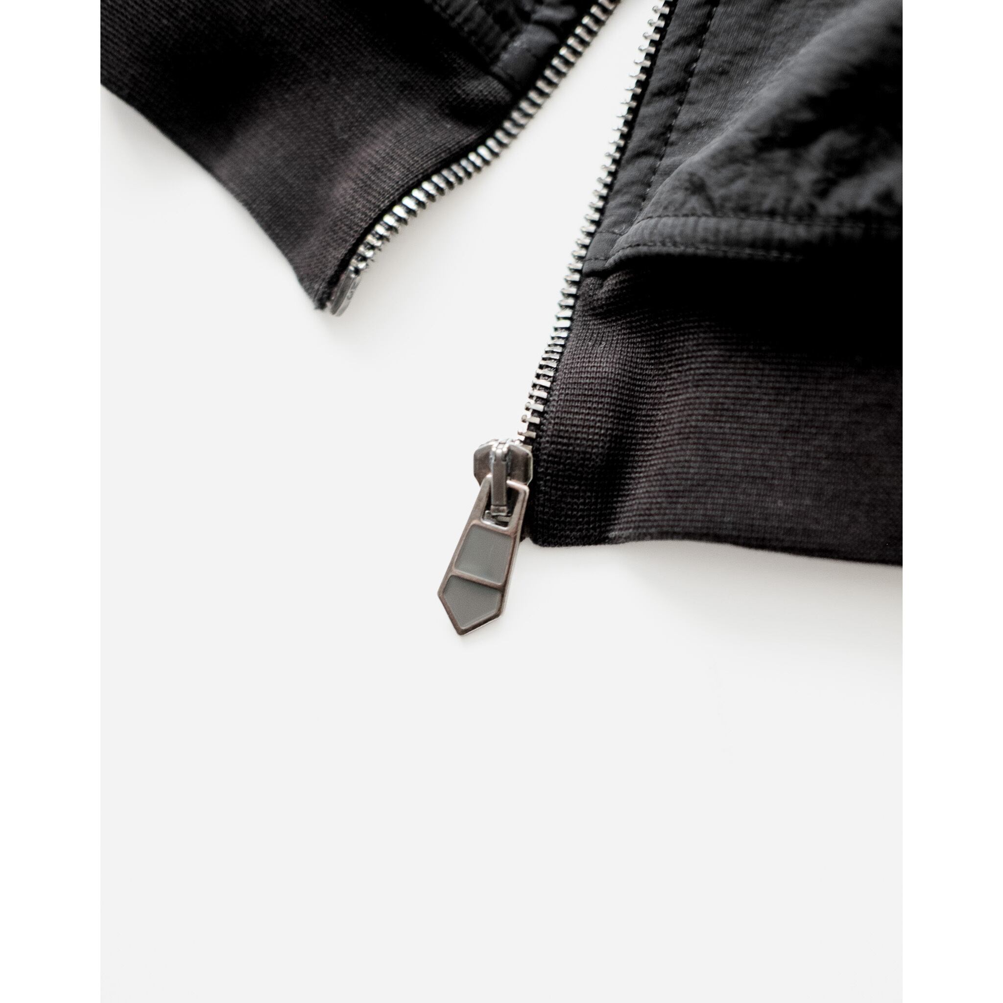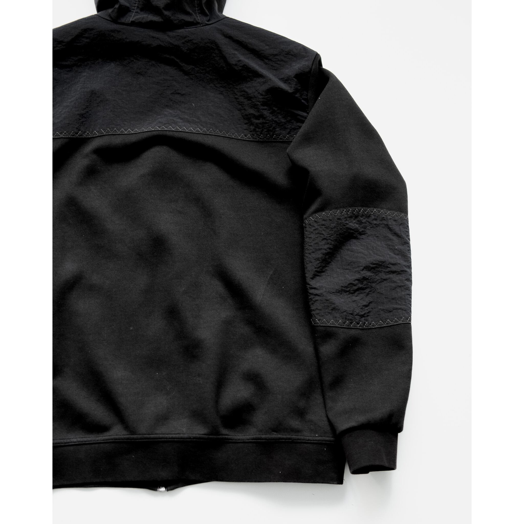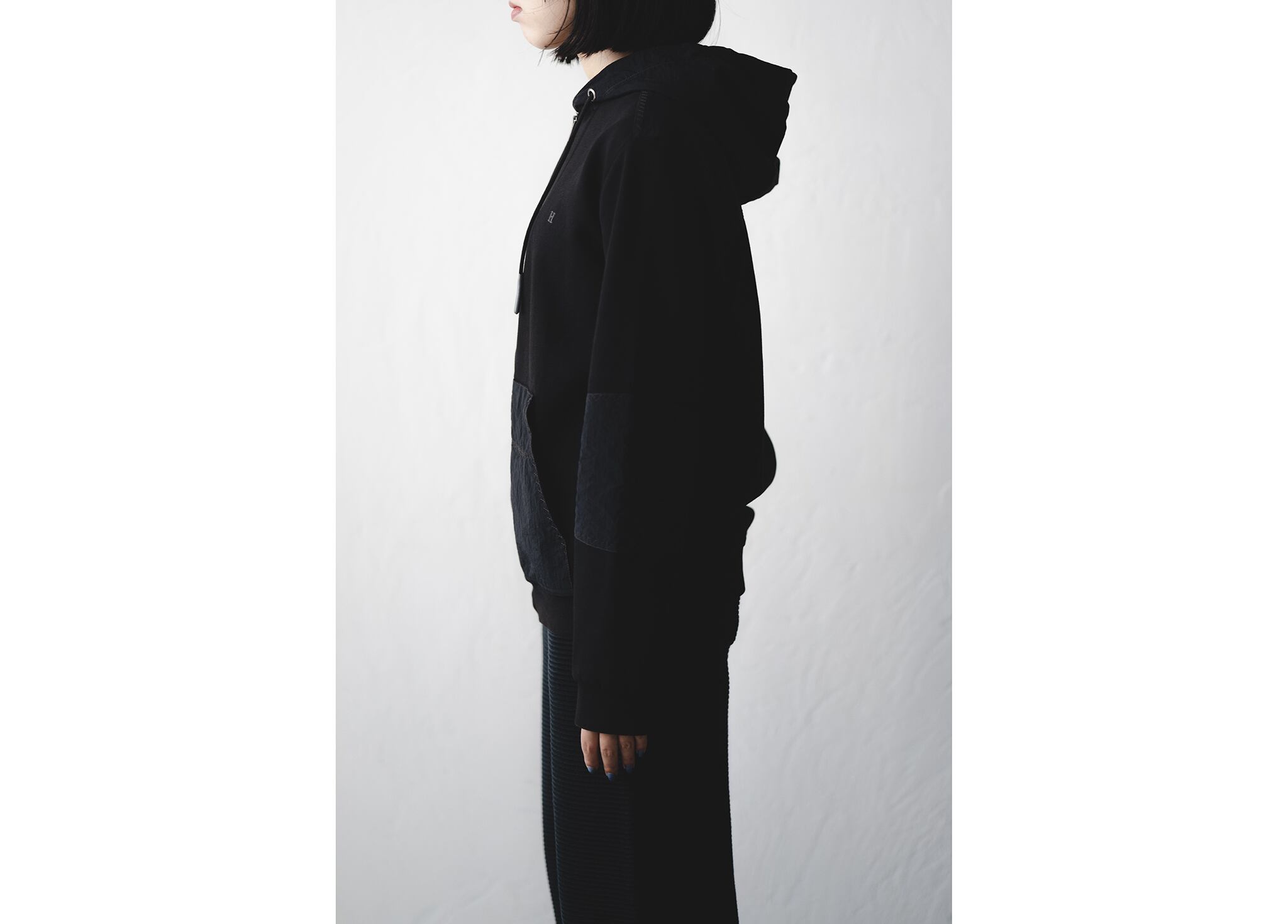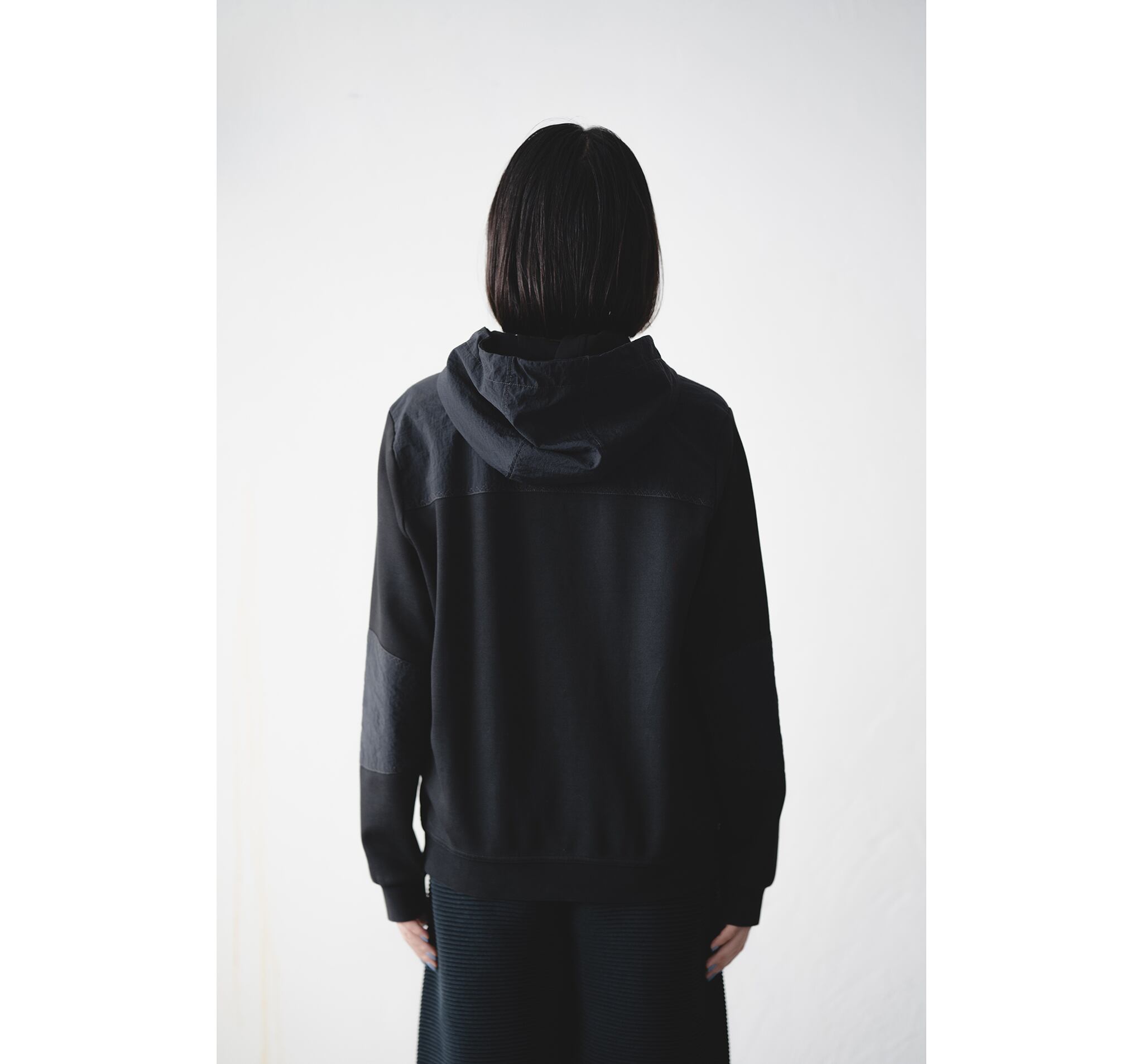 フード、背面、フロントポケット、エルボーパッチに使われているのはシワ感のあるナイロン。
