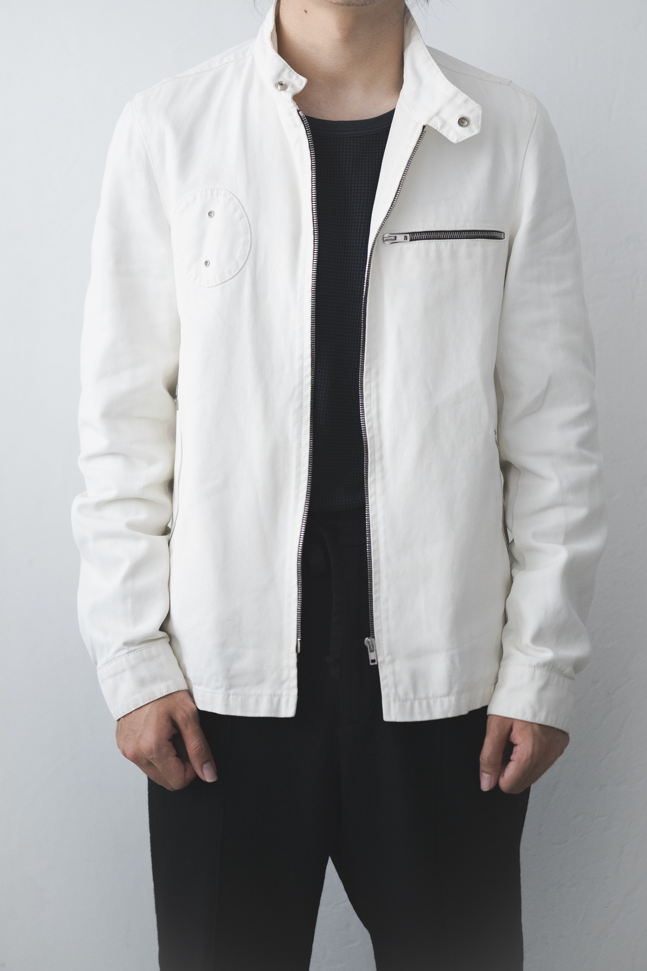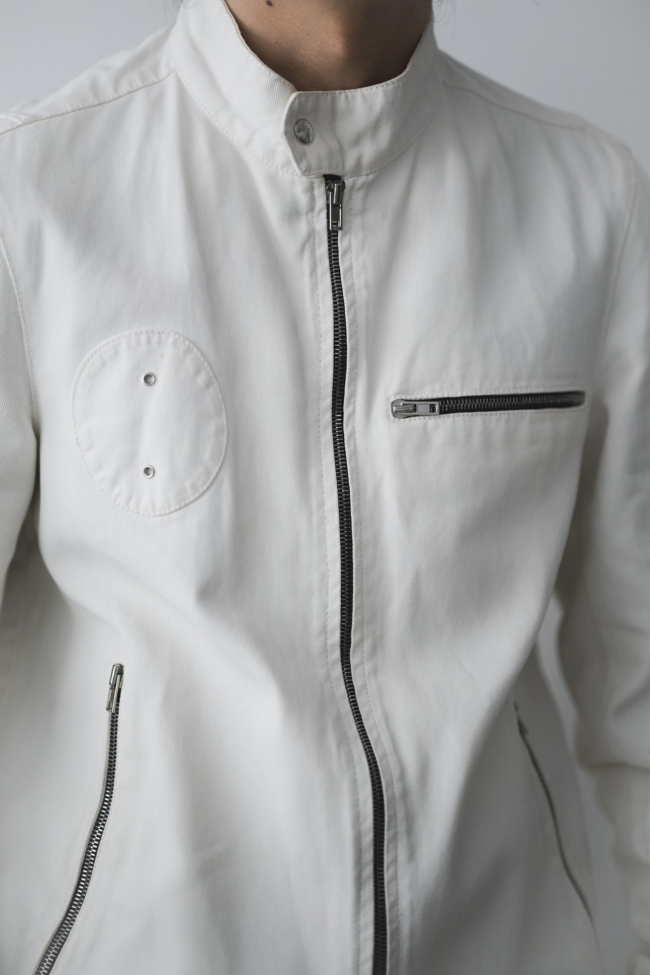 直線的でスタイリッシュなカッティングですが、右胸には円形のパッチが。