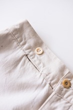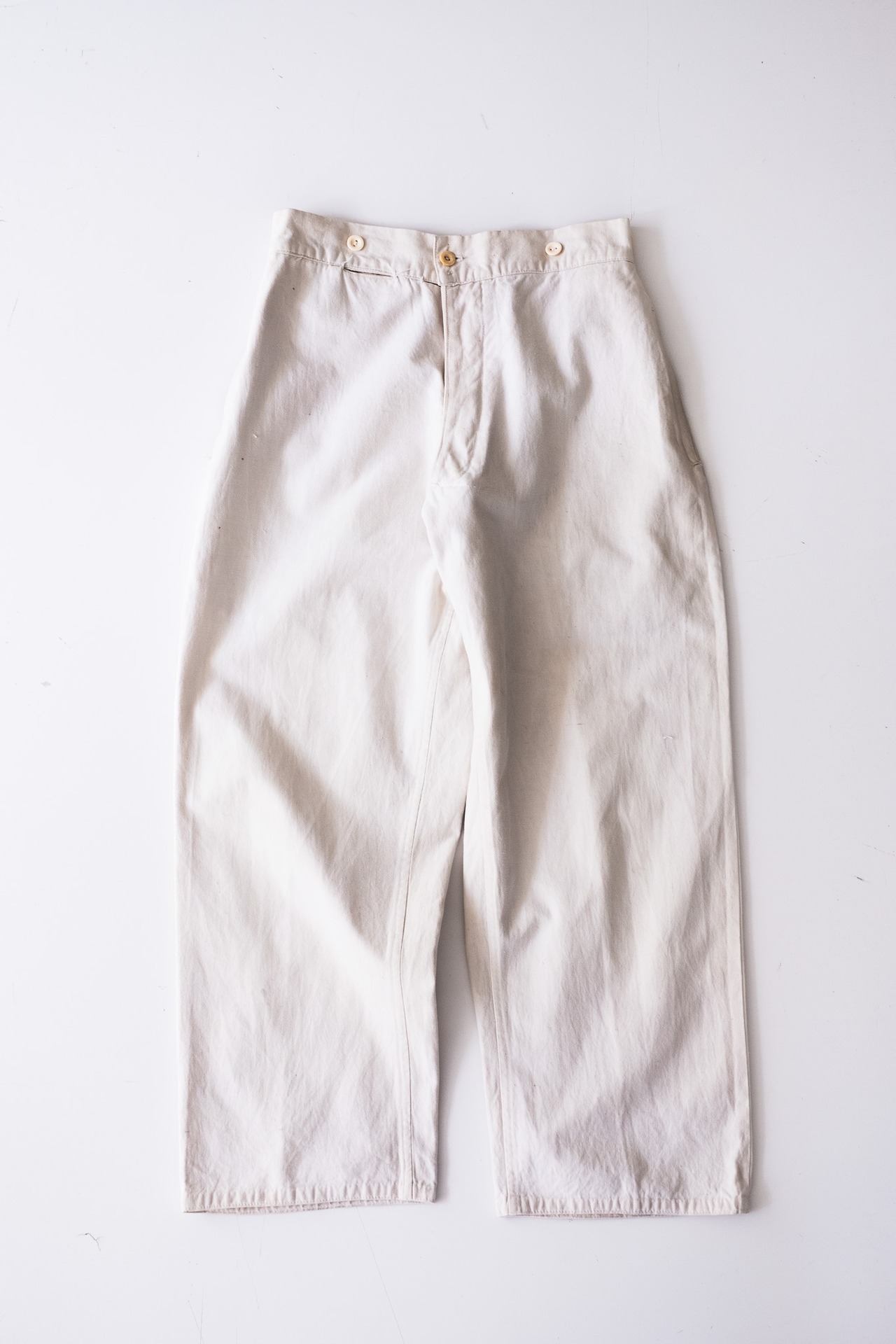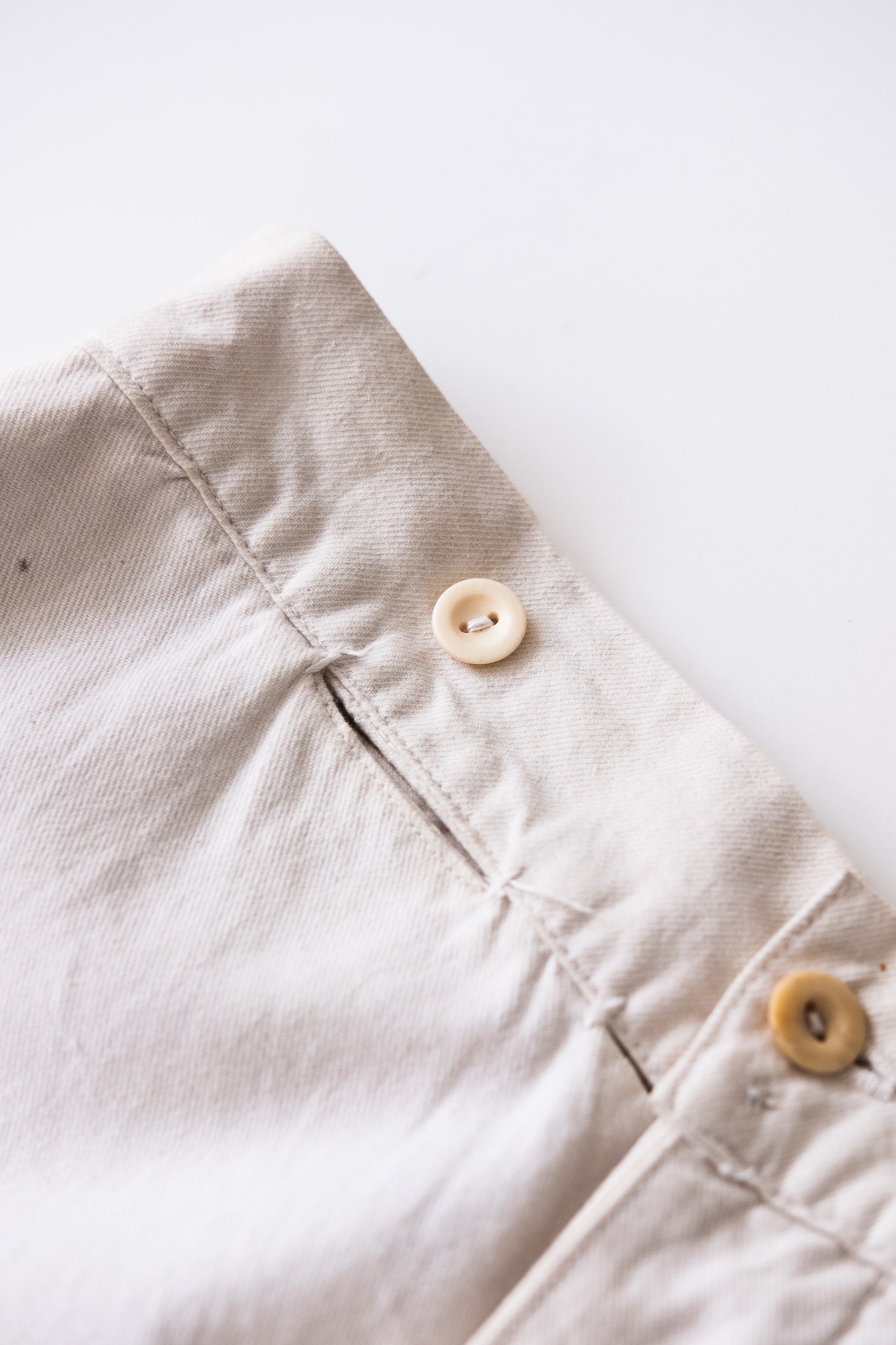 このトラウザーズの魅力は、生地だけではありません。ボーンボタン(骨製ボタン)が用いられている点は特筆すべきディテールであり、これは1910年代以前に製造された個体であることを示す、非常に重要な指標です。20世紀以降はコストや大量生産の都合により、次第にプラスチックや樹脂に切り替わっていく中、骨製ボタンは職人的な仕立てと物資の限られた時代背景を象徴しています。