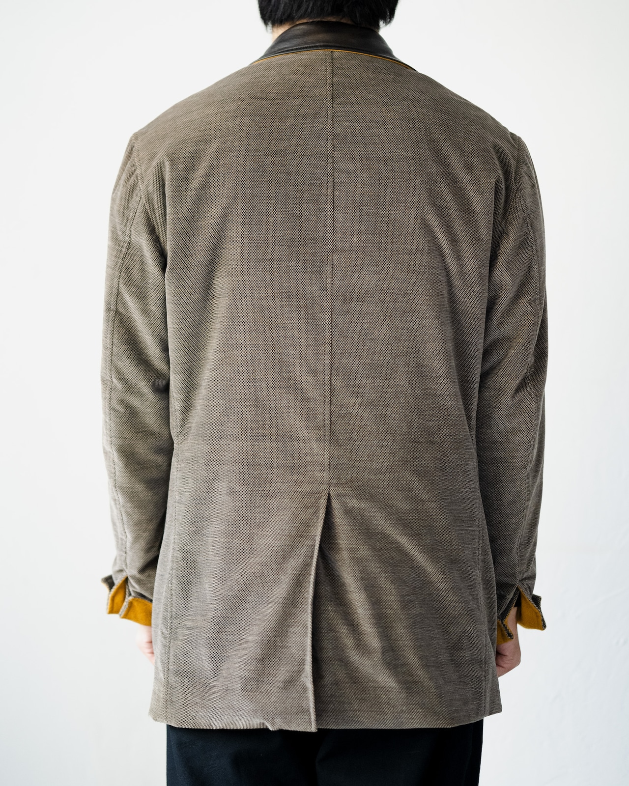 襟には美しいシボ感と発色、吸い付くような肌触りのブラウンのレザーパーツの切り替え。