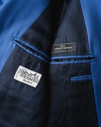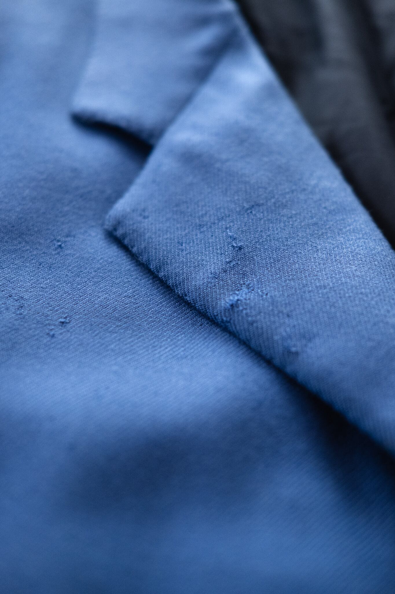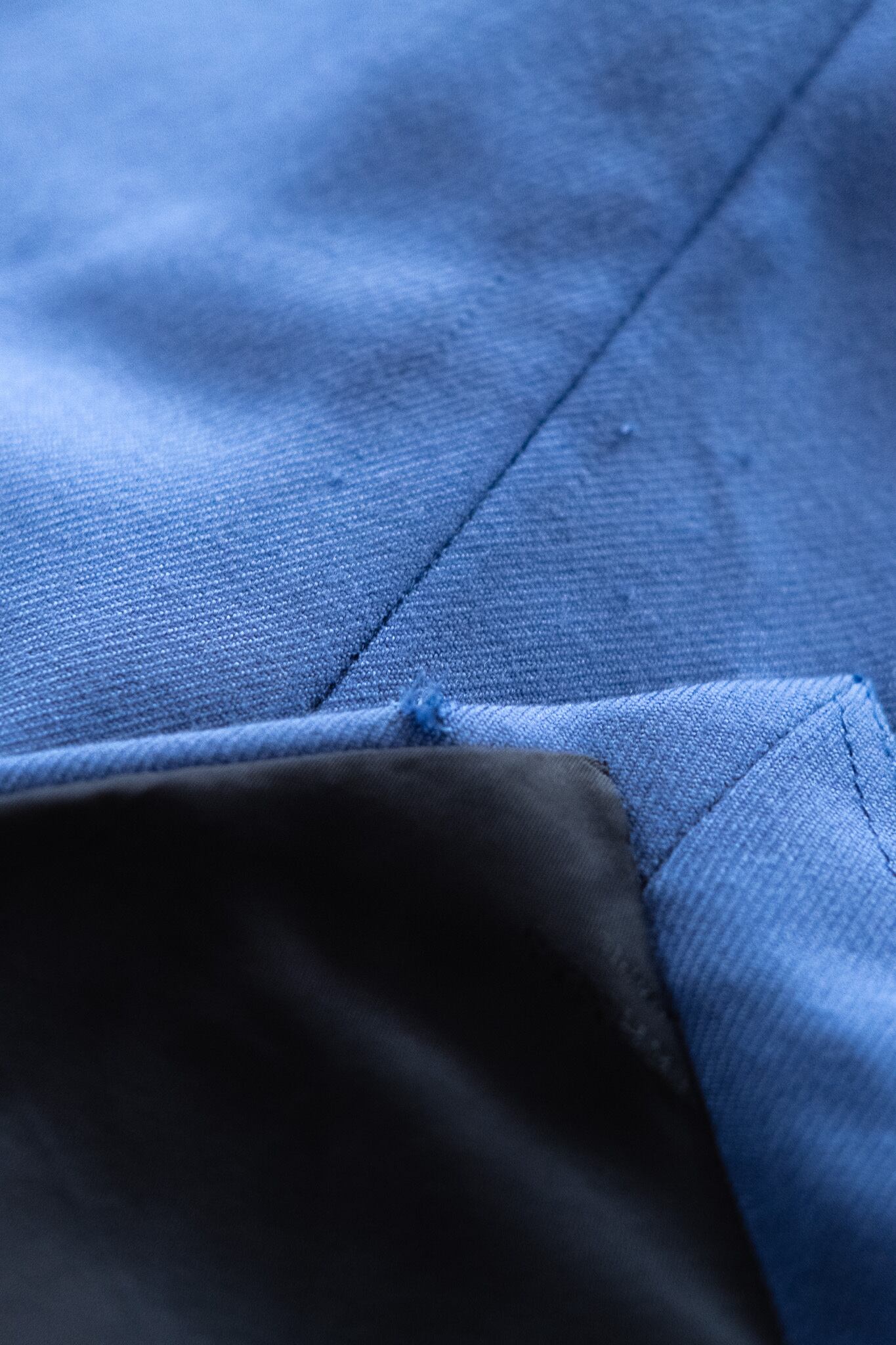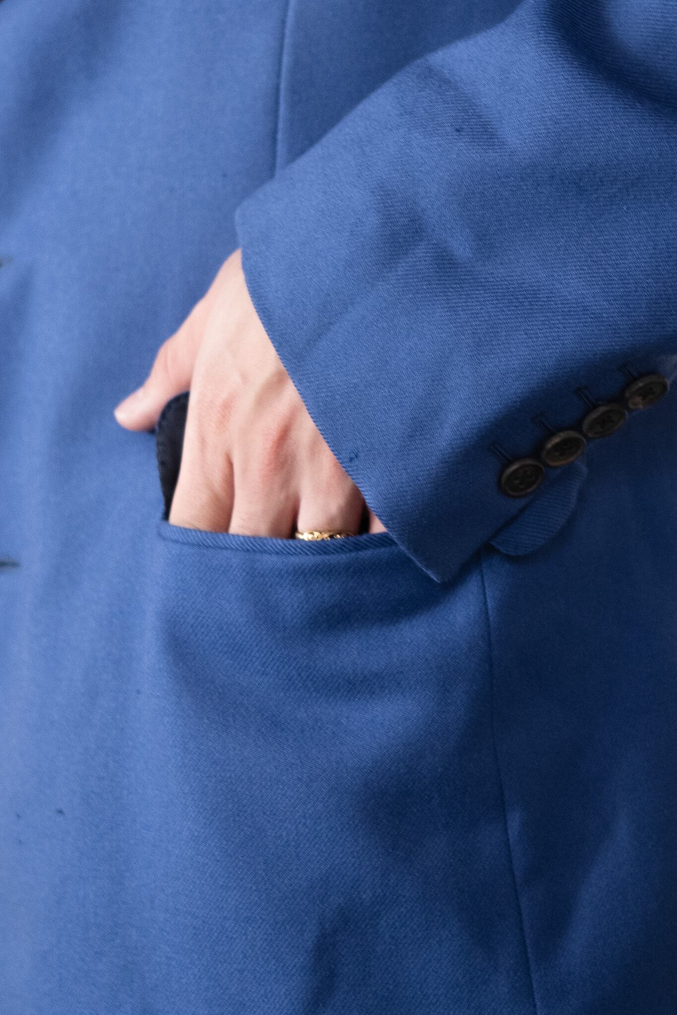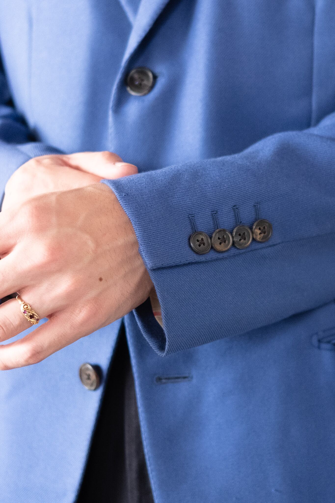 表地のブルーと響き合うネイビーの裏地には、随所にパイピングが施され、丁寧な縫製が強調されます。フロントのボタンはホーン素材を思わせるマーブル調で、控えめながら天然素材特有の存在感を放っています。