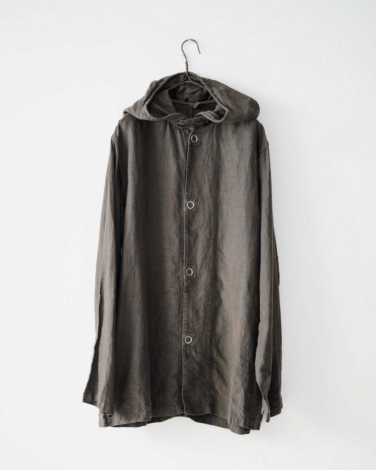 ナチュラルかつ上品な風合いのリネンは、ボタンの無機質な輝きと、大きなフードのモードなディテールと合わさって、落ち着きながらも何処か毒のある雰囲気に。